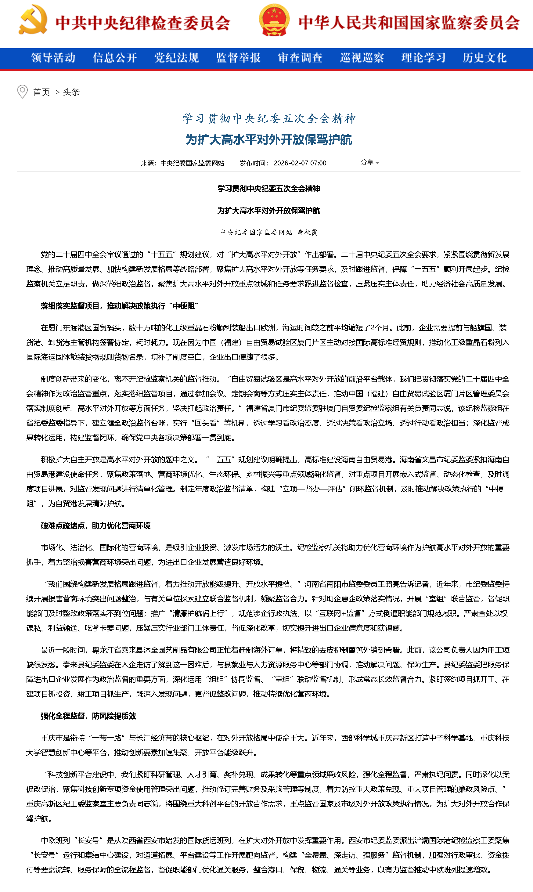 党的二十届四中全会审议通过的“十五五”规划建议,对“扩大高水平对外开放”作出部署。二十届中央纪委五次全会要求,紧紧围绕贯彻新发展理念、推动高质量发展、加快构建新发展格局等战略部署,聚焦扩大高水平对外开放等任务要求,及时跟进监督,保障“十五五”顺利开局起步。纪检监察机关立足职责,做深做细政治监督,聚焦扩大高水平对外开放重点领域和任务要求跟进监督检查,压紧压实主体责任,助力经济社会高质量发展。