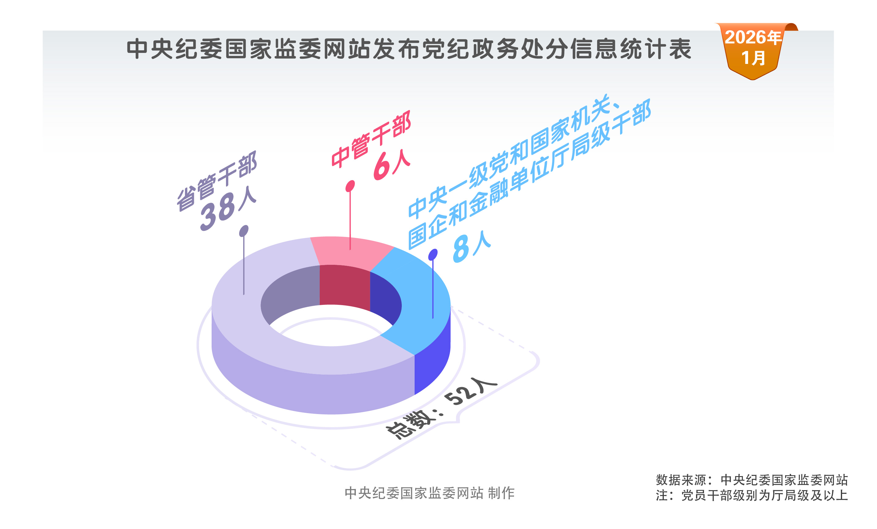 20261月,中央纪委国家监委网站共发布52条党纪政务处分信息。其中,中管干部6人,中央一级党和国家机关、国企和金融单位厅局级干部8人,省管干部38人。