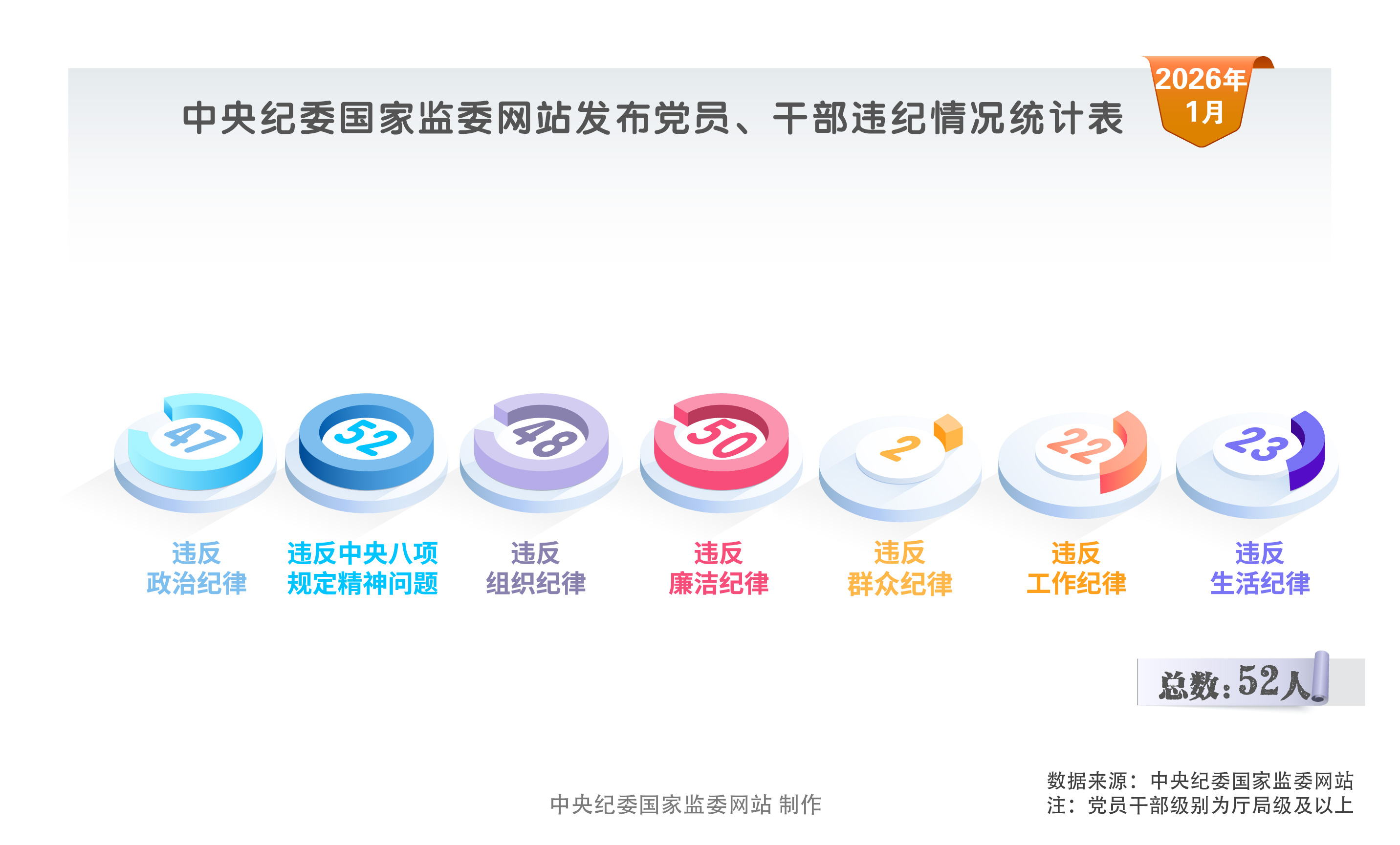 20261月,中央纪委国家监委网站发布的52条党纪政务处分信息中,47人违反政治纪律,52人违反中央八项规定精神,48人违反组织纪律,50人违反廉洁纪律,2人违反群众纪律,22人违反工作纪律,23人违反生活纪律。