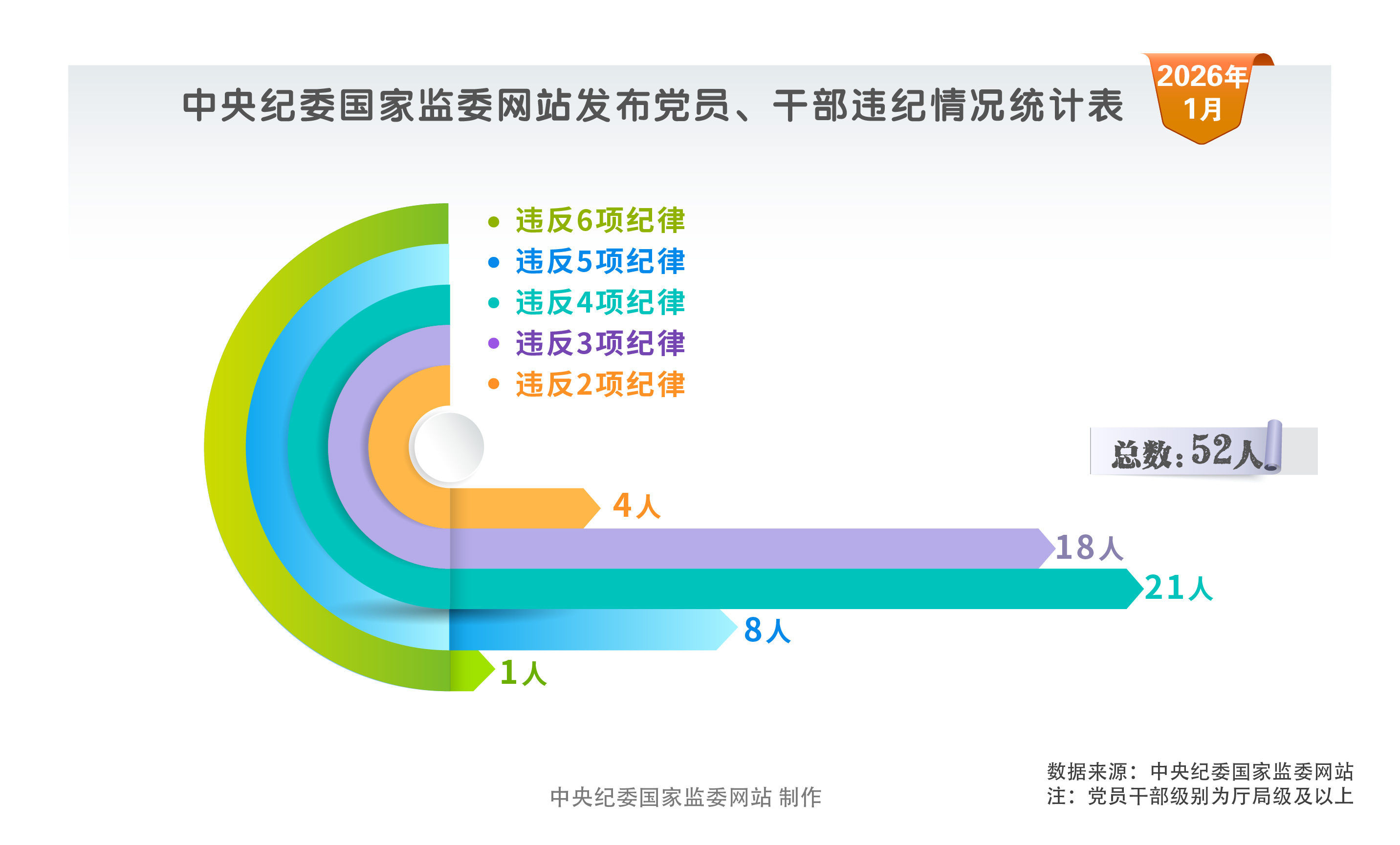 20261月,在中央纪委国家监委网站发布的党纪政务处分信息中,被处分党员、干部多数违反多项纪律。违反6项纪律的1人,违反5项纪律的8人,违反4项纪律的21人,违反3项纪律的18人,违反2项纪律的4人。