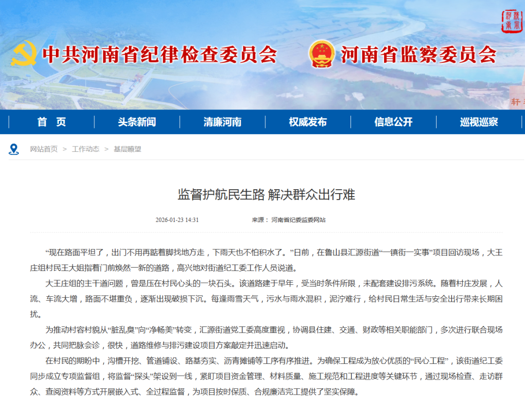 在村民的期盼中,沟槽开挖、管道铺设、路基夯实、沥青摊铺等工序有序推进。为确保工程成为放心优质的“民心工程”,该街道纪工委同步成立专项监督组,将监督“探头”架设到一线,紧盯项目资金管理、材料质量、施工规范和工程进度等关键环节,通过现场检查、走访群众、查阅资料等方式开展嵌入式、全过程监督,为项目按时保质、合规廉洁完工提供了坚实保障。
