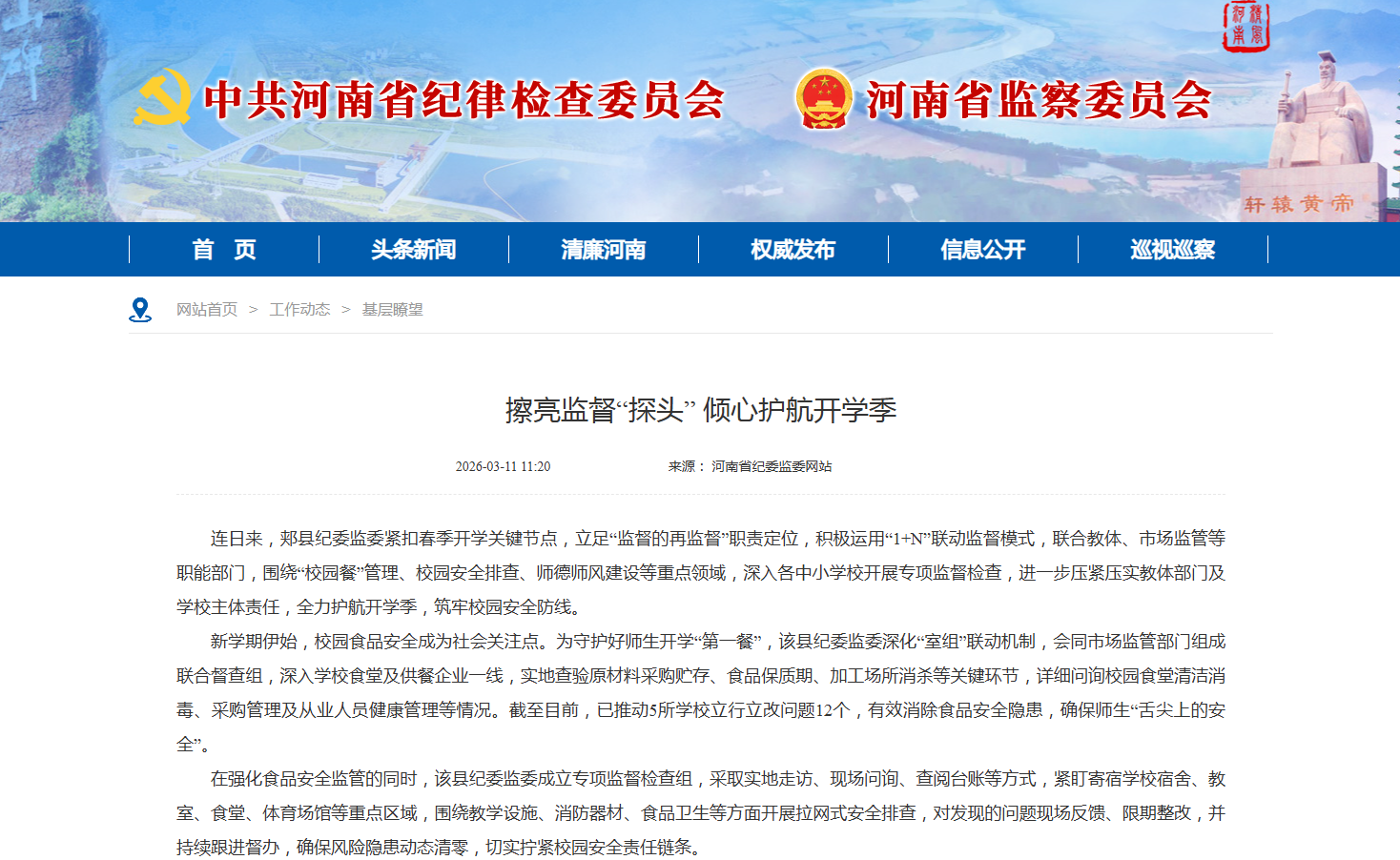 新学期伊始,校园食品安全成为社会关注点。为守护好师生开学“第一餐”,该县纪委监委深化“室组”联动机制,会同市场监管部门组成联合督查组,深入学校食堂及供餐企业一线,实地查验原材料采购贮存、食品保质期、加工场所消杀等关键环节,详细问询校园食堂清洁消毒、采购管理及从业人员健康管理等情况。截至目前,已推动5所学校立行立改问题12个,有效消除食品安全隐患,确保师生“舌尖上的安全”。