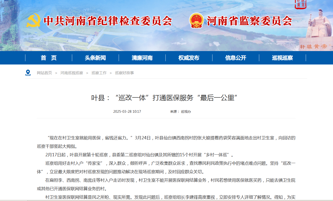 “现在在村卫生室就能用医保,省钱还省力。”3月24日,叶县仙台镇西南拐村的张大娘提着药袋笑容满面地走出村卫生室,向回访的巡察干部竖起大拇指。