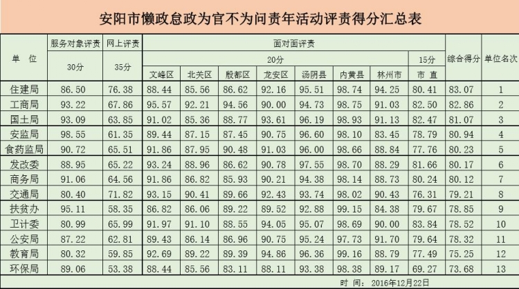 按照安阳市人民政府办公室《关于印发安阳市懒政怠政为官不为问责年活动评责工作方案的通知》(安政办明电〔2016〕217号)要求,11月26日—12月26日,我市利用一个月时间集中对13个政府部门系统进行了评责。现将评责情况通报如下: