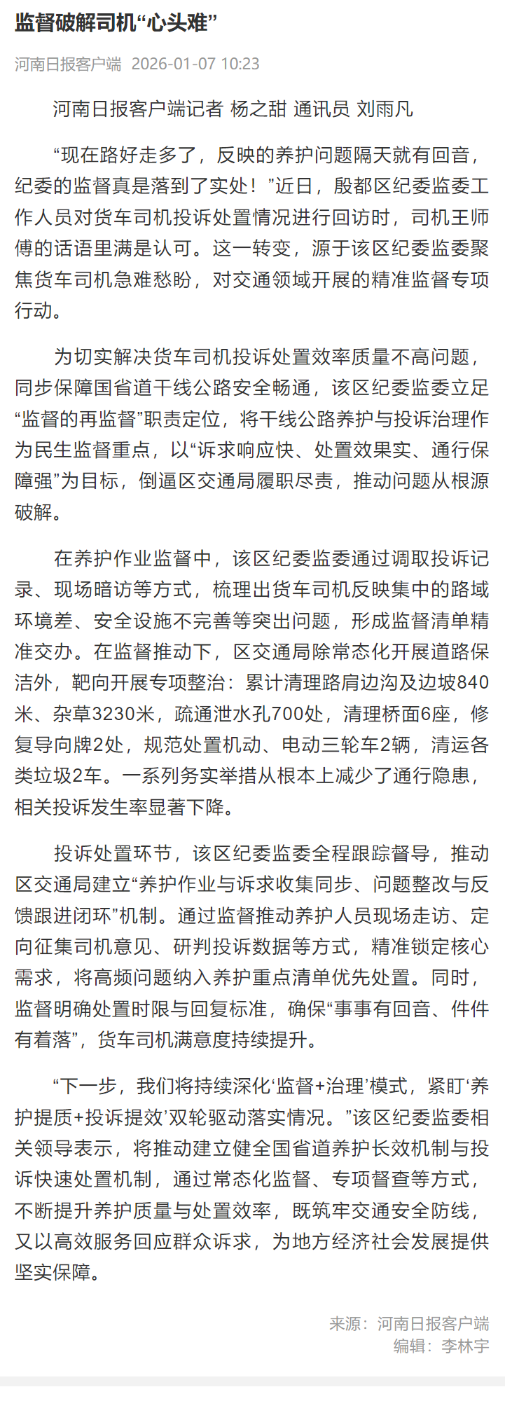 “下一步,我们将持续深化‘监督+治理’模式,紧盯‘养护提质+投诉提效’双轮驱动落实情况。”该区纪委监委相关领导表示,将推动建立健全国省道养护长效机制与投诉快速处置机制,通过常态化监督、专项督查等方式,不断提升养护质量与处置效率,既筑牢交通安全防线,又以高效服务回应群众诉求,为地方经济社会发展提供坚实保障。(河南日报客户端记者 杨之甜 通讯员 刘雨凡)