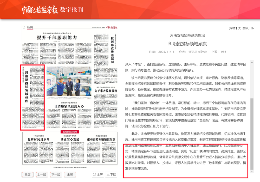 此外,该市纪委监委强化市县联动,协同发力推动招投标领域治理,切实净化市场生态。林州市将工程建设项目招投标纳入巡察重点事项,制定工程项目招标投标领域腐败和违法犯罪问题表现形式清单,巡察组带着清单入驻巡察,通过核查资料、比对数据等方式,精准锁定各环节违规违纪违法问题,实现“纪巡”联动同向发力、高效排查。殷都区纪委监委强化智慧监督,督促区公共资源交易中心在监管平台嵌入智能分析系统,通过大数据比对碰撞,对招标人、投标人、评标人的异常行为进行“数字画像”与动态预警,精准识别潜在风险。(刘婷菠)