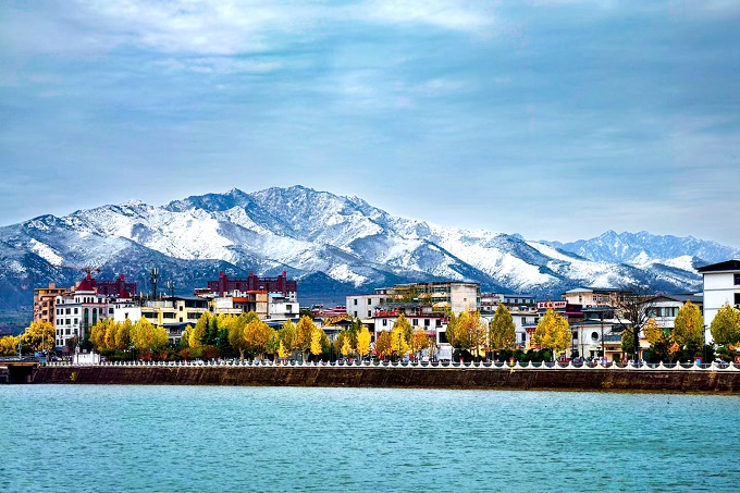 灵宝市迎来今年冬天的第一场雪,市区内河水青蓝,河畔的树木着上金装,远处群山披上银衣,宛然一幅绝美的西部雪山画卷。(灵宝市纪委监委 郑军胜 摄)