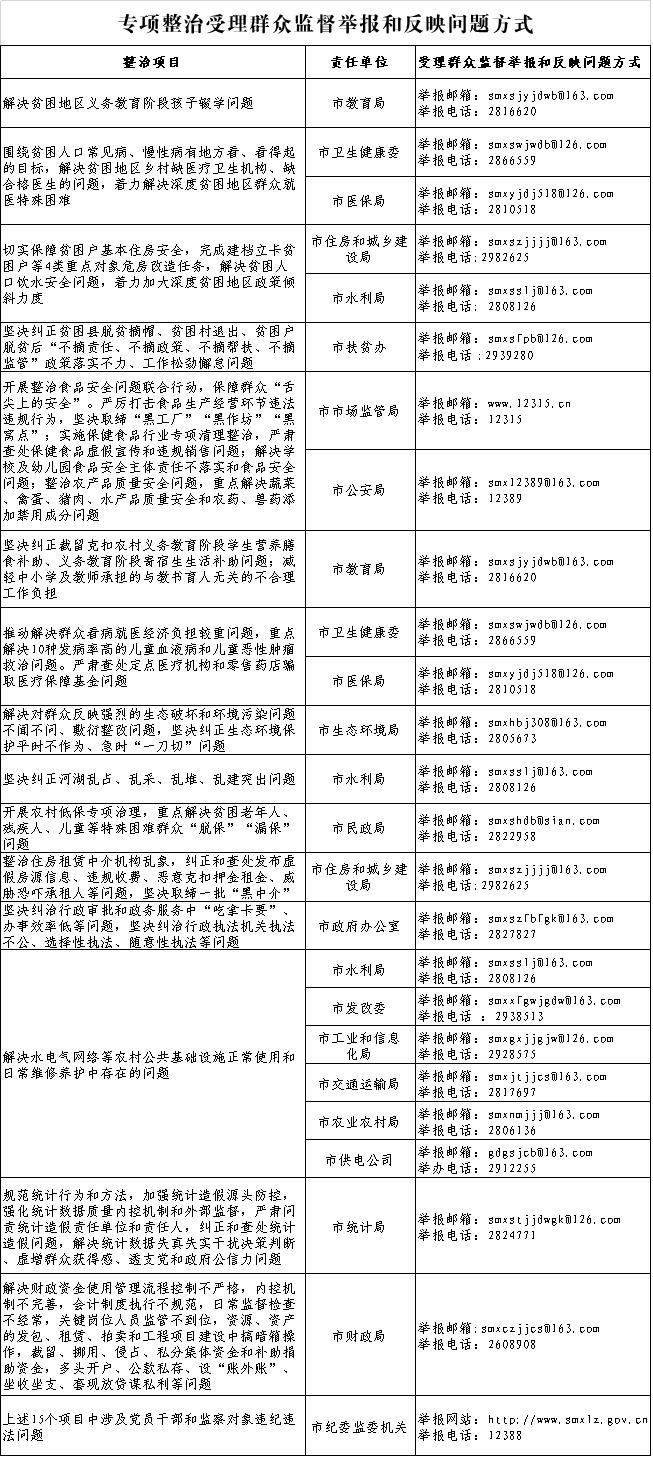 为方便群众参与监督和反映问题,现将专项整治受理群众监督举报和反映问题方式公布如下。